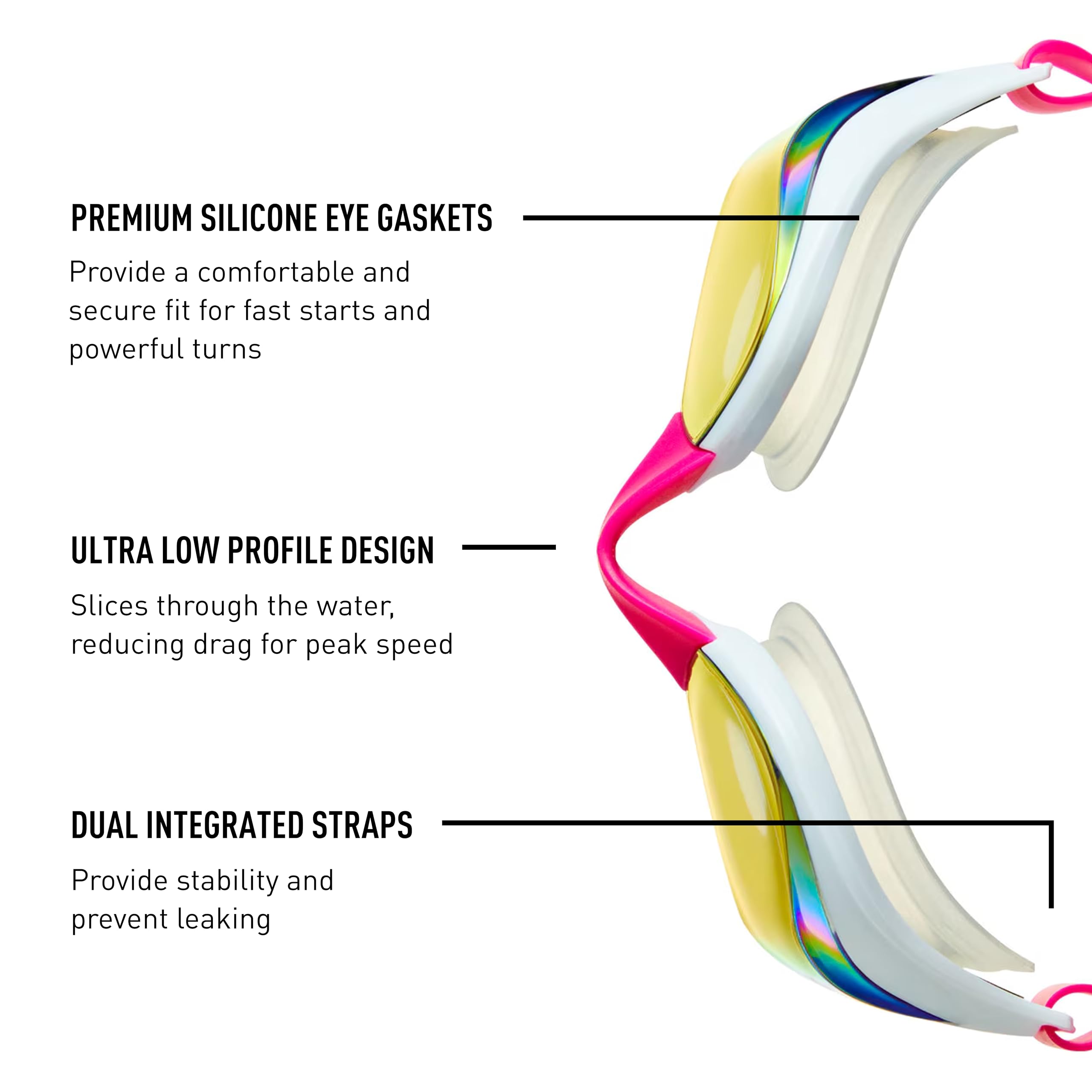 - FIT: Precision engineering and premium silicone gaskets ensure a secure fit around the eye Straps pull in line with the eyes and distribute pressure evenly, making for a comfortable and leak-proof swim